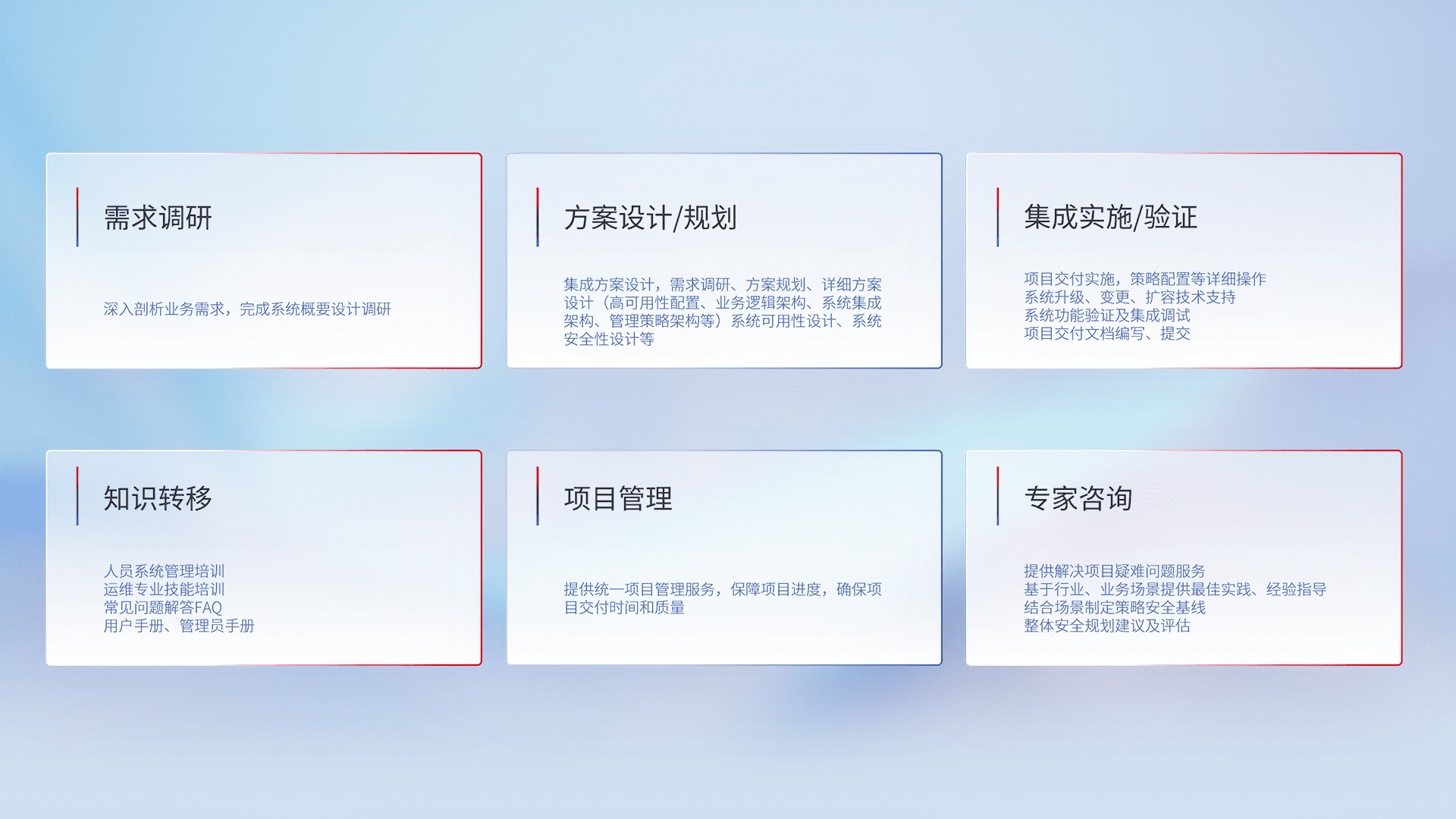 针对客户行业特性,,将宏观的安全战略和需求,,,通过专业的交付服务,,,实现项目落地,,,,为客户提供标准规范的集成交付服务。。。